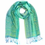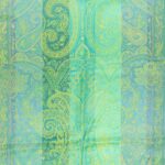 Bei diesem Schal sind verschiedene Farbtöne miteinander verwoben: ein kräftiges Grün mit hellem Blauton, dazu ein helles Grün als Ergänzung.